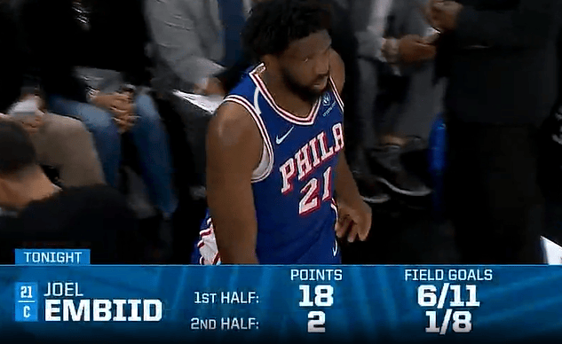 Trong số đó, Embiid ghi được 18 điểm ở 6/11 cú sút trong hiệp một, nhưng sang hiệp hai, tình thế bất ngờ thay đổi và anh chỉ ghi được 2 điểm ở 1/10 cú sút.